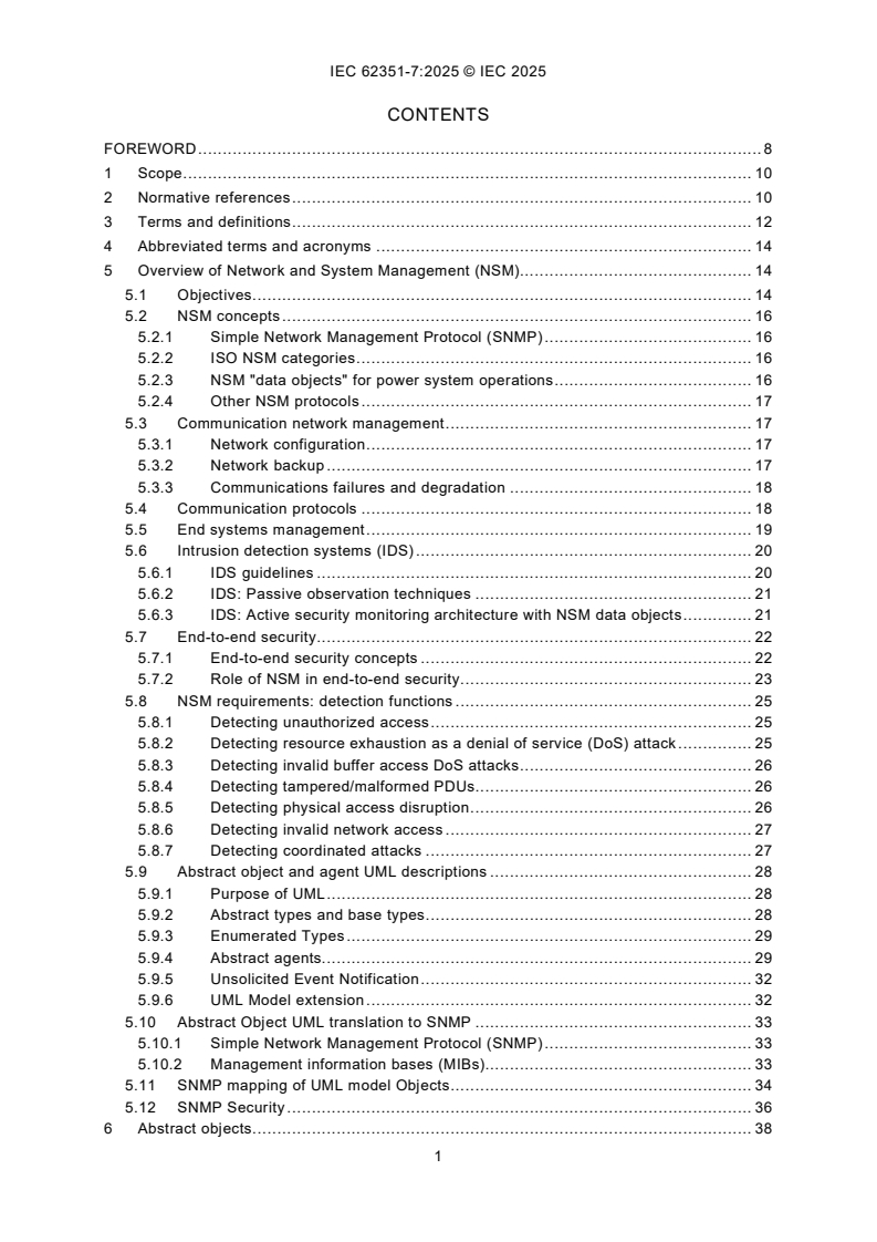 IEC 62351-7:2025 defines network and system management (NSM) data object models that are specific to power system operations. These NSM data objects will be used to monitor the health of networks and systems, to detect possible security intrusions, and to manage the performance and reliability of the information infrastructure. The goal is to define a set of abstract objects that will allow the remote monitoring of the health and condition of IEDs (Intelligent Electronic Devices), RTUs (Remote Terminal Units), DERs (Distributed Energy Resources) systems and other systems that are important to power system operations.