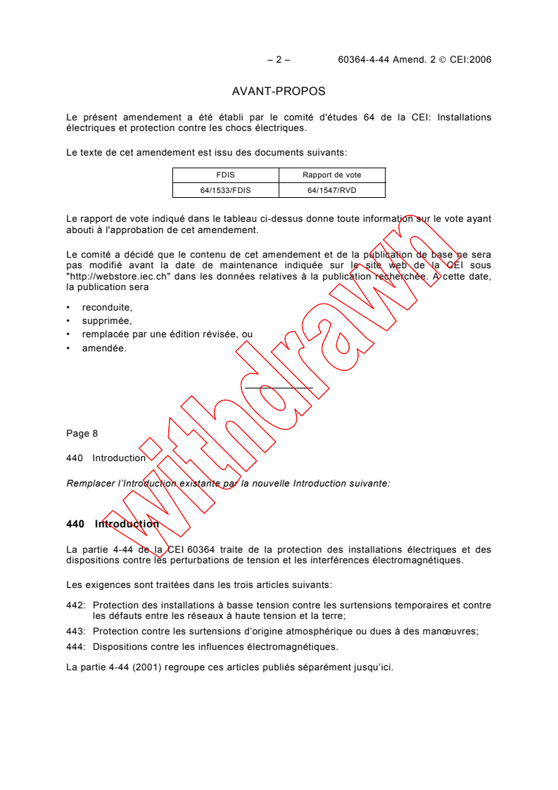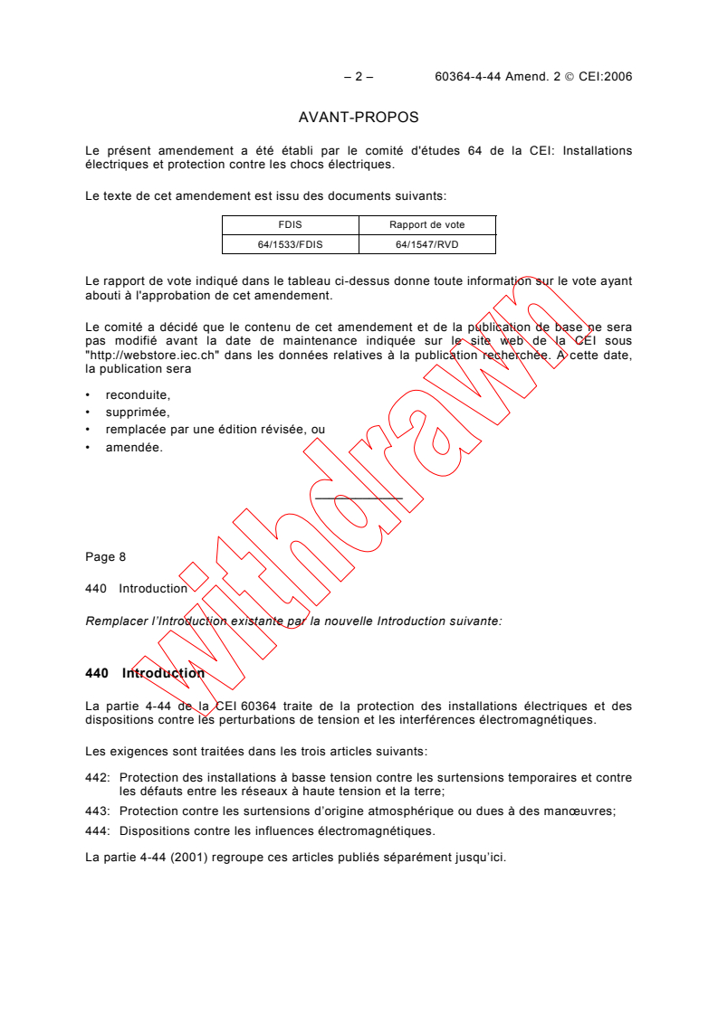 IEC 60364-4-44:2001/AMD2:2006 - Amendement 2 - Installations électriques des bâtiments - Partie 4-44: Protection pour assurer la sécurité - Protection contre les perturbations de tension et les perturbations électromagnétiques Released:8/15/2006