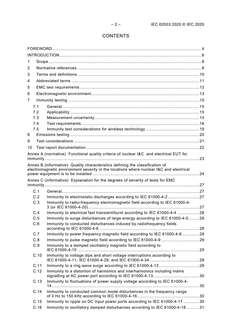 IEC 62003:2020 is a standard published by the International Electrotechnical Commission (IEC). Its full title is "Nuclear power plants - Instrumentation, control and electrical power systems - Requirements for electromagnetic compatibility testing". This standard covers: IEC 62003:2020 establishes requirements for electromagnetic compatibility testing of instrumentation, control, and electrical equipment supplied for use in systems important to safety at nuclear power plants and other nuclear facilities. The document lists the applicable IEC standards (principally the IEC 61000 series) which define the general test methods, and provides the necessary application-specific parameters and criteria to ensure that nuclear safety requirements are met. This second edition cancels and replaces the first edition published in 2009. This edition includes the following significant technical changes with respect to the previous edition: a) title modified. b) expand the scope to encompass Electromagnetic Magnetic Compatibility (EMC) considerations for electrical equipment. c) provide guidance for addressing the use of wireless technology. d) enhance the description of the electromagnetic environment to provide clarification when selecting custom test levels or for test exemptions. e) include example information to be contained within an EMC test plan. f) provide guidance for characterization of the electromagnetic environment at the point of installation within a nuclear facility.