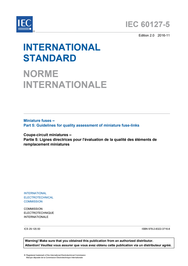 IEC 60127-5:2016, titled Miniature fuses - Part 5: Guidelines for quality assessment of miniature fuse-links, is an international standard published by the International Electrotechnical Commission (IEC). This edition offers updated, technical guidelines for assessing the quality of miniature fuse-links used extensively in electrical and electronic devices. It primarily targets manufacturers and large-scale users managing lot sizes of 10,000 units or more but is also applicable to smaller lots when necessary.