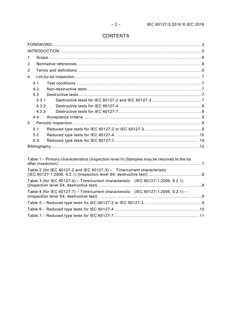 IEC 60127-5:2016 is a standard published by the International Electrotechnical Commission (IEC). Its full title is "Miniature fuses - Part 5: Guidelines for quality assessment of miniature fuse-links". This standard covers: IEC 60127-5:2016 gives a guide for tests for assessing the quality of miniature fuse-links other than type tests, for the case where there is no complete agreement between the user and the manufacturer on what such tests apply. This document provides guidelines and limits generally acceptable for quality control purposes by large scale users and manufacturers of miniature fuse-links. This document has validity for large scale series with lot sizes of 10 000 and more. It is also applicable for smaller lot sizes, if necessary. Periodic inspections by reduced type tests (Clause 5) are intended to be carried out periodically in order to ensure that the level of technical performance previously verified by complete type tests as given in subsequent parts of the IEC 60127 series is maintained. The frequency of periodic in relation to lot-by-lot inspections is not established in this document. This second edition cancels and replaces the first edition published in 1988. This edition constitutes a technical revision. This edition includes the following significant technical changes with respect to the previous edition: - addition of new tables in 4.3; - addition of new tables in Clause 5. Keywords: quality of miniature fuse-links