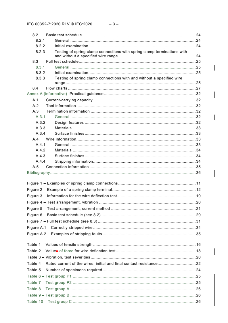 IEC 60352-7:2020 is a standard published by the International Electrotechnical Commission (IEC). Its full title is "Solderless connections - Part 7: Spring clamp connections - General requirements, test methods and practical guidance". This standard covers: IEC 60352-7:2020 is applicable to spring clamp connections made with stripped wire without further preparation: - stranded conductors of 0,08 mm2 to 10 mm2 cross-section, or - flexible conductors of 0,08 mm2 to 10 mm2 cross-section, according to IEC 60228 or IEC 60189-3 for use in electrical and electronic equipment and components. Information on materials and data from industrial experience is included in addition to the test procedures to provide electrically stable connections under prescribed environmental conditions. The object of this document is to determine the suitability of spring clamp connections under specified mechanical, electrical and atmospheric conditions. This second edition cancels and replaces the first edition of IEC 60352-7, published in 2002. This edition constitutes a technical revision. This edition includes the following significant technical changes with respect to the previous edition: a) correction of the two flow charts in Figure 6 and Figure 7, b) split the content into more clauses for better separation between full test schedule and basic test schedule, c) relocating the content of former Clause 6 Practical guidance into an informative Annex A, as now common in the IEC 60352 series for solderless connections, d) clarification on conductor types with reference to classes defined in IEC 60228.