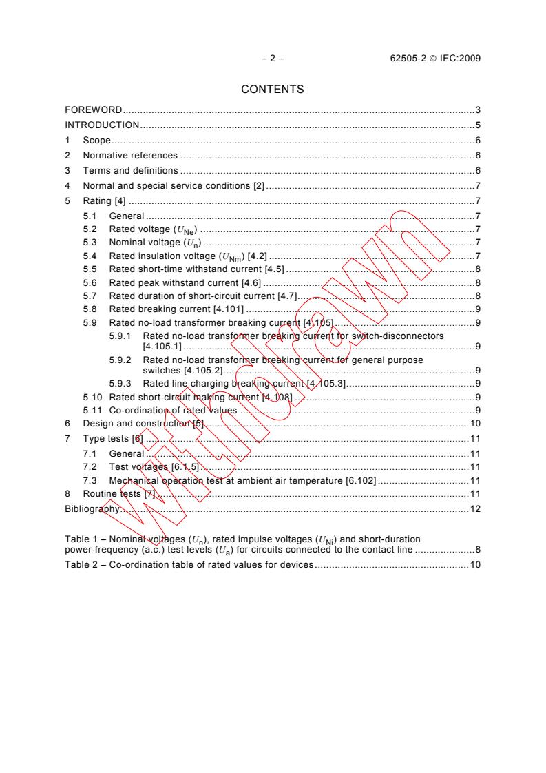 IEC 62505-2:2009 is applicable to single-phase a.c. one-pole disconnectors, earthing switches and switches (switch-disconnectors and general purpose switches) designed for indoor or outdoor fixed installations for operation at frequencies of 16,7 Hz, 50 Hz and 60 Hz on traction systems having an UNm above 1 kV up to 52 kV.