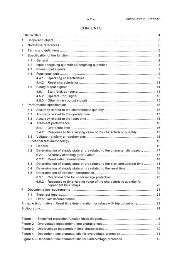 IEC 60255-127:2010 specifies minimum requirements for over/under voltage relays. The standard includes specification of the protection function, measurement characteristics and time delay characteristics.