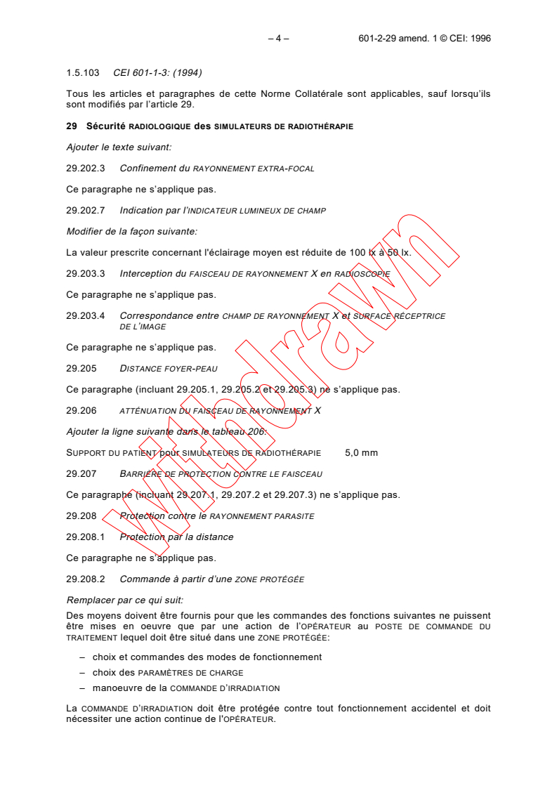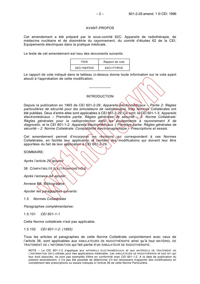Incorpore les révisions qui correspondent aux Normes Collatérales CEI 601-1-2 et CEI 601-1-3, en facilite leur application et contient des modifications qui doivent leur être apportées du fait de leur application à la CEI 601-2-29.