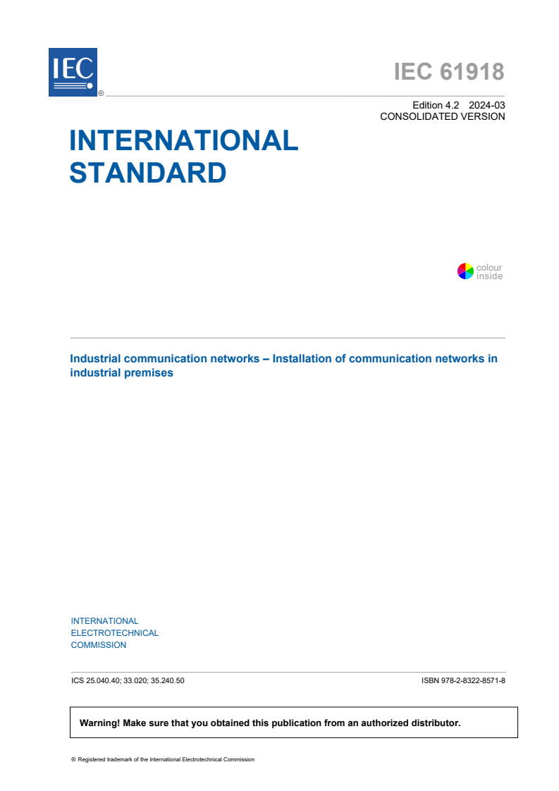 IEC 61918:2018 - Industrial communication networks - Installation of communication networks in industrial premises Released:9/20/2018