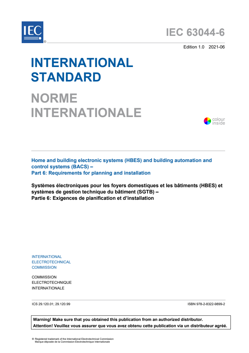 IEC 63044-6:2021 - Home and building electronic systems (HBES) and building automation and control systems (BACS) - Part 6: Requirements for planning and installation Released:6/29/2021