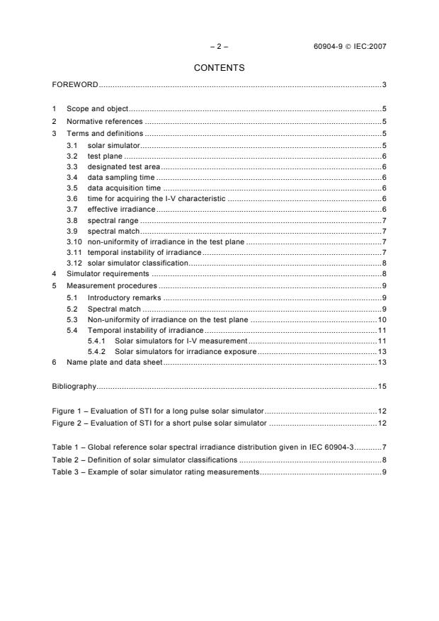 IEC 60904-9:2007 is a standard published by the International Electrotechnical Commission (IEC). Its full title is "Photovoltaic devices - Part 9: Solar simulator performance requirements". This standard covers: Defines classifications of solar simulators for use in indoor measurements of terrestrial photovoltaic devices; solar simulators are classified as A, B or C for each of the three categories based on criteria of spectral distribution match, irradiance non-uniformity on the test plane and temporal instability. Provides the required methodologies for determining the rating achieved by a solar simulator in each of the categories. The main change with respect to the previous edition consists of a redefinition of the classifications and additional measurement procedures.