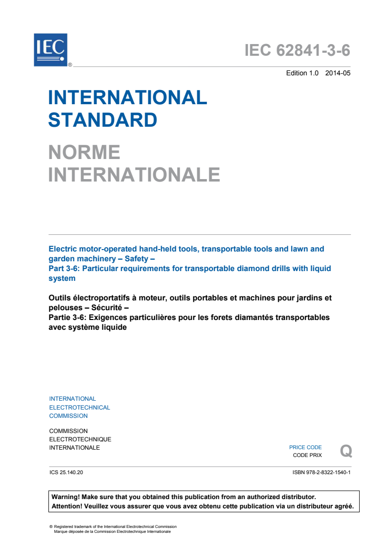 IEC 62841-3-6:2014 - Electric motor-operated hand-held tools, transportable tools and lawn and garden machinery - Safety - Part 3-6: Particular requirements for transportable diamond drills with liquid system Released:5/23/2014