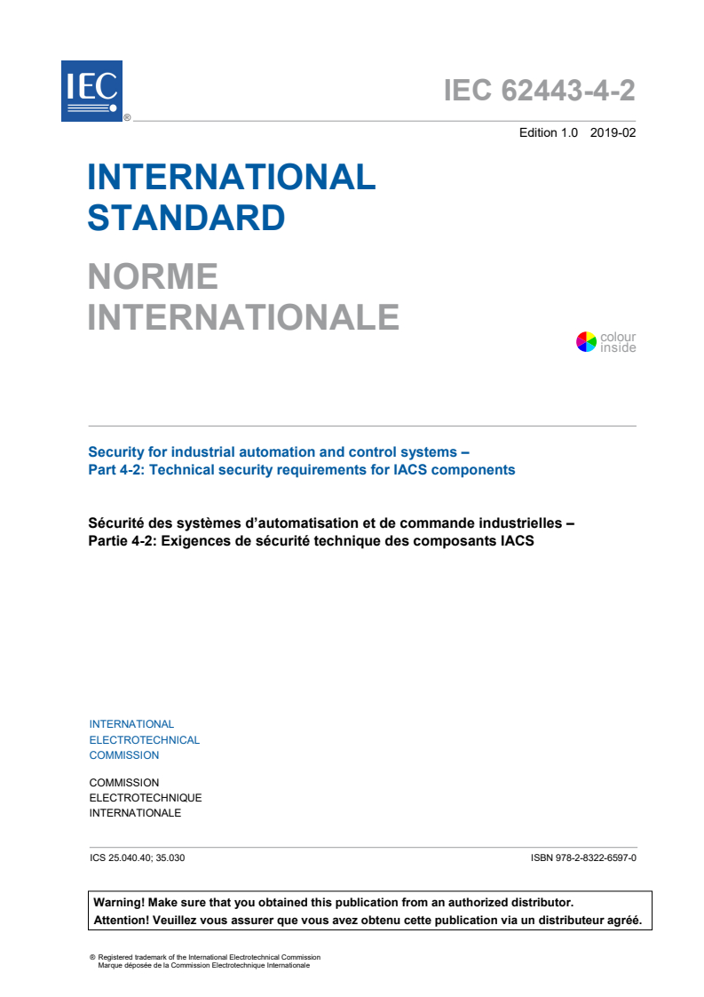 IEC 62443-4-2:2019 is a standard published by the International Electrotechnical Commission (IEC). Its full title is "Security for industrial automation and control systems - Part 4-2: Technical security requirements for IACS components". This standard covers: IEC 62443-4-2:2019 provides detailed technical control system component requirements (CRs) associated with the seven foundational requirements (FRs) described in IEC TS 62443-1-1 including defining the requirements for control system capability security levels and their components, SL-C(component). As defined in IEC TS 62443-1-1 there are a total of seven foundational requirements (FRs): a) identification and authentication control (IAC), b) use control (UC), c) system integrity (SI), d) data confidentiality (DC), e) restricted data flow (RDF), f) timely response to events (TRE), and g) resource availability (RA). These seven FRs are the foundation for defining control system security capability levels. Defining security capability levels for the control system component is the goal and objective of this document as opposed to SL-T or achieved SLs (SL-A), which are out of scope. The contents of the corrigendum of August 2022 have been included in this copy.