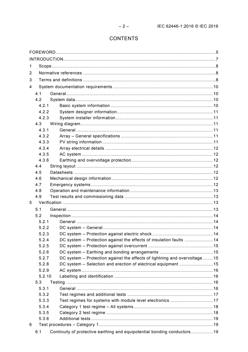 IEC 62446-1:2016 defines the information and documentation required to be handed over to a customer following the installation of a grid connected PV system. It also describes the commissioning tests, inspection criteria and documentation expected to verify the safe installation and correct operation of the system. It is for use by system designers and installers of grid connected solar PV systems as a template to provide effective documentation to a customer. This new edition cancels and replaces IEC 62446 published in 2009 and includes the following significant technical change with respect to IEC 62446:2009: expansion of the scope to include a wider range of system test and inspection regimes to encompass larger and more complex PV systems.