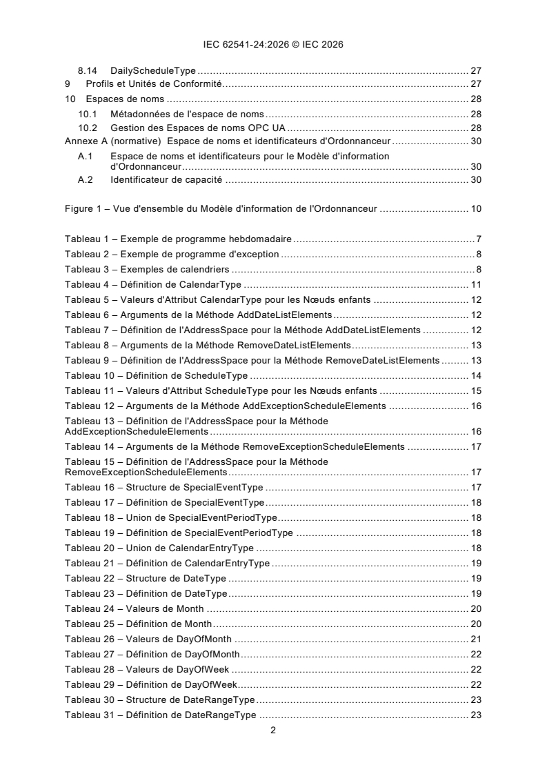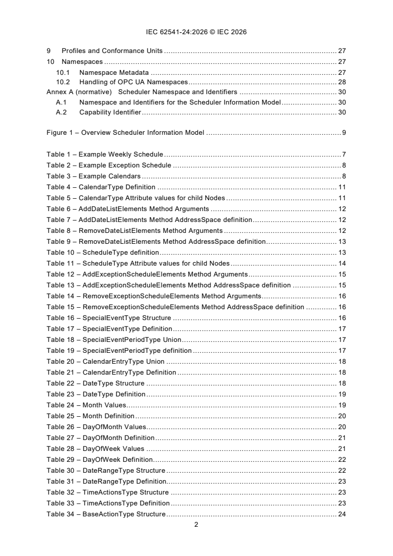 IEC 62541-24:2026 specifies an OPC UA information model to expose information, at what dates and times specific actions are executed by the OPC UA Server. Those schedules can optionally also be manipulated via the information model. The schedule defines on which dates they are active, and can also reference global calendars representing specific dates, for example public holidays. In addition, the schedule defines times and actions that will be executed at that time. The model defines writing Variables and calling Methods but can be extended to other actions as well. The NamespaceUri for all NodeIds defined in this document is defined in Annex A.
