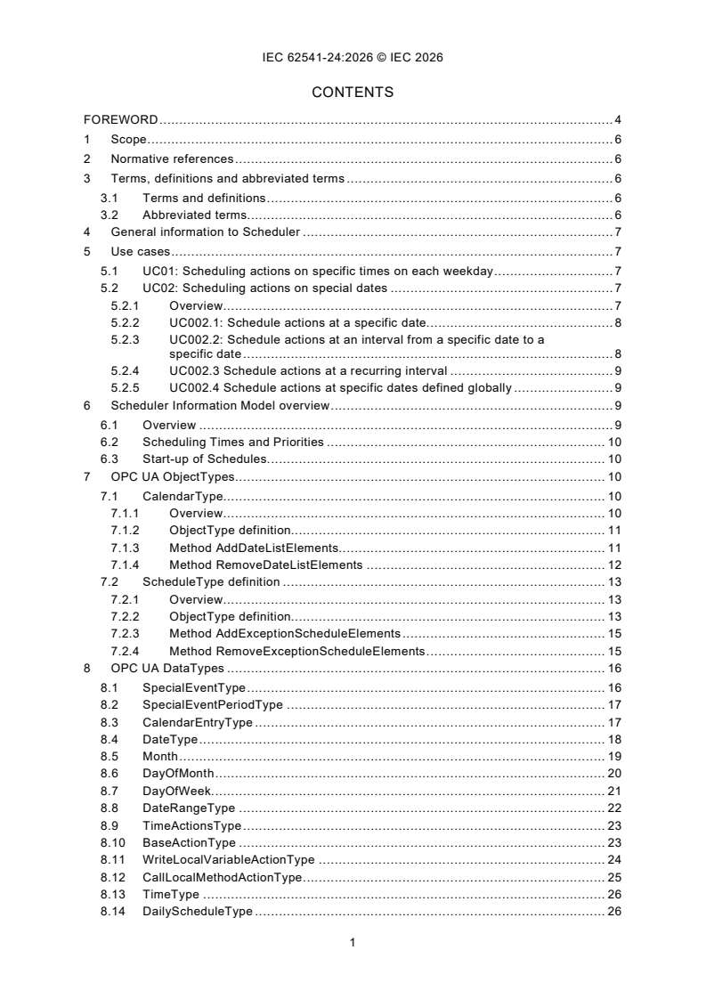 IEC 62541-24:2026 specifies an OPC UA information model to expose information, at what dates and times specific actions are executed by the OPC UA Server. Those schedules can optionally also be manipulated via the information model.