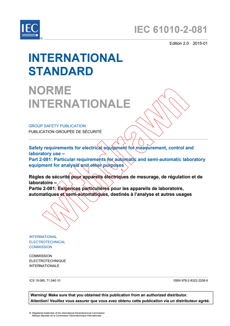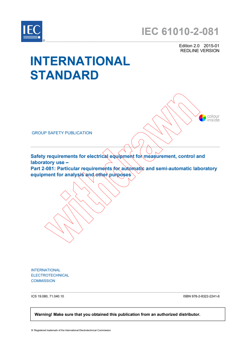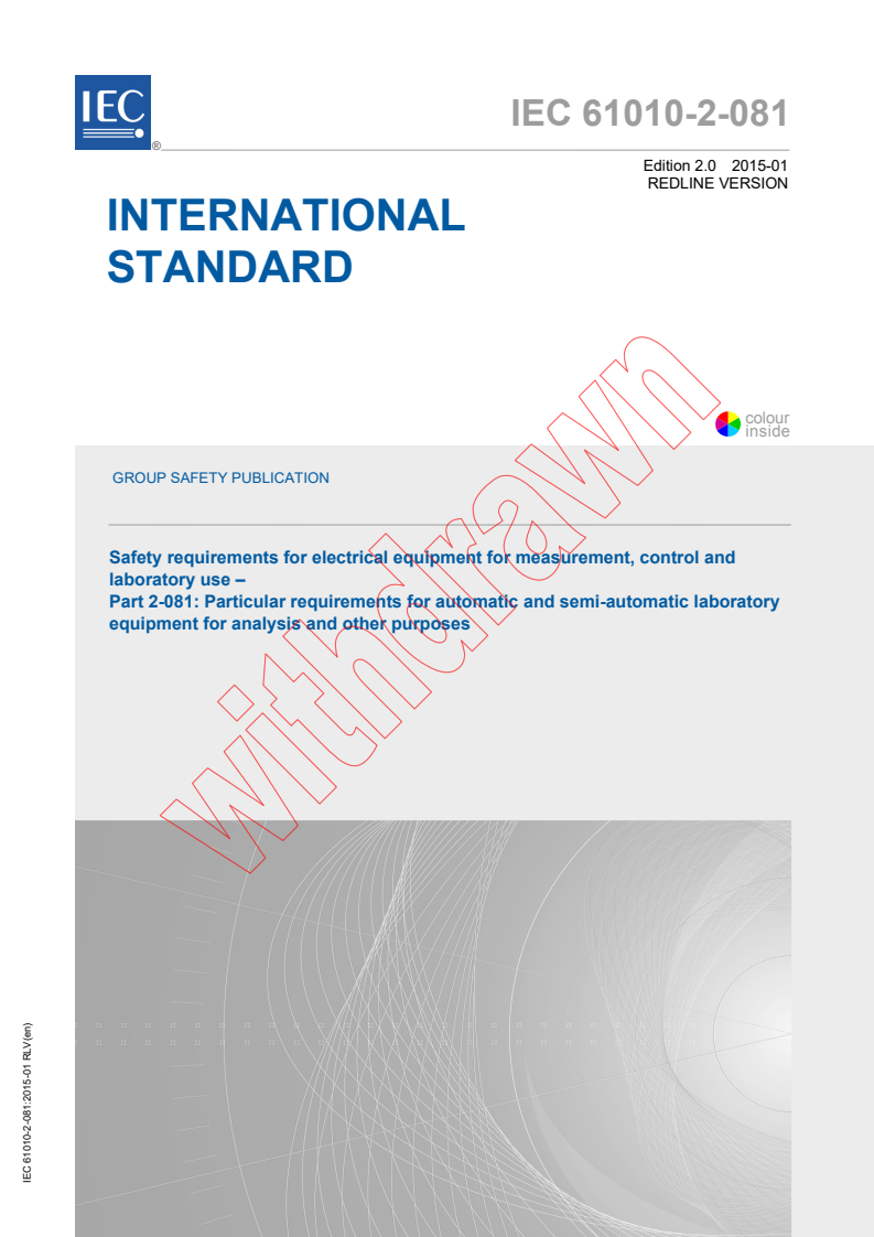 IEC 61010-2-081:2015 RLV - Safety requirements for electrical equipment for measurement, control and laboratory use – Part 2-081: Particular requirements for automatic and semi-automatic laboratory equipment for analysis and other purposes Released:1/23/2015