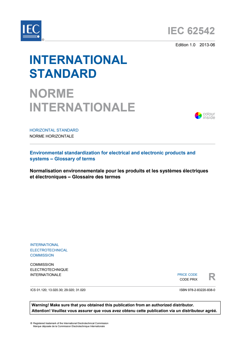 IEC 62542:2013 is a standard published by the International Electrotechnical Commission (IEC). Its full title is "Environmental standardization for electrical and electronic products and systems - Glossary of terms". This standard covers: IEC 62542:2013 specifies generic terms and definitions that are related to environmental standardization within the IEC. It serves as a glossary of terminology to be considered for environmental aspects of relevant work in IEC. The terms cover environmental issues that are relevant for electrotechnical products across all product life cycle stages. It has the status of a horizontal standard in accordance with IEC Guide 108.