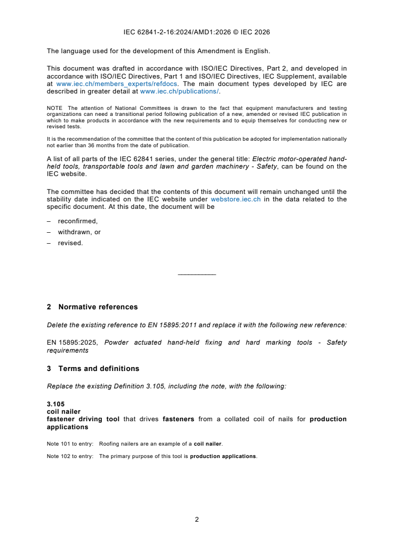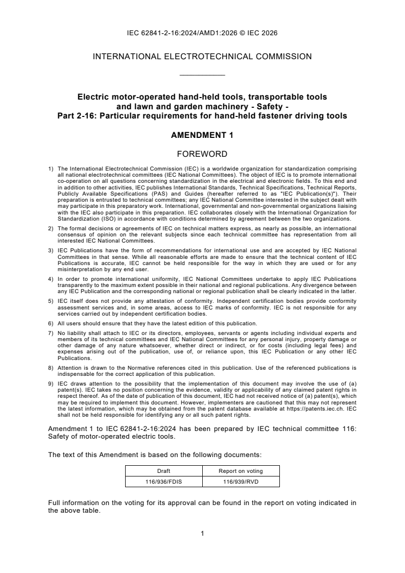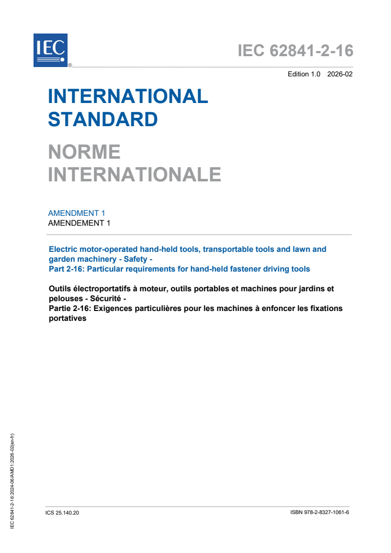 IEC 62841-2-16:2024/AMD1:2026 - Amendment 1 - Electric motor-operated hand-held tools, transportable tools and lawn and garden machinery - Safety - Part 2-16: Particular requirements for hand-held fastener driving tools