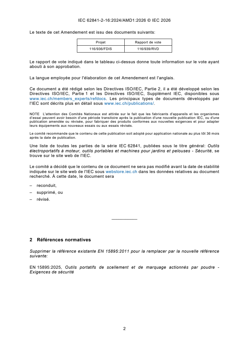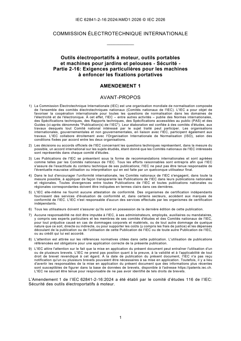 IEC 62841-2-16:2024/AMD1:2026 - Amendement 1 - Outils électroportatifs à moteur, outils portables et machines pour jardins et pelouses - Sécurité - Partie 2-16: Exigences particulières pour les machines à enfoncer les fixations portatives