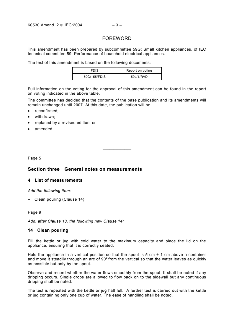 IEC 60530:1975/AMD2:2004 - Amendment 2 - Methods for measuring the performance of electric kettles and jugs for household and similar use Released:5/14/2004