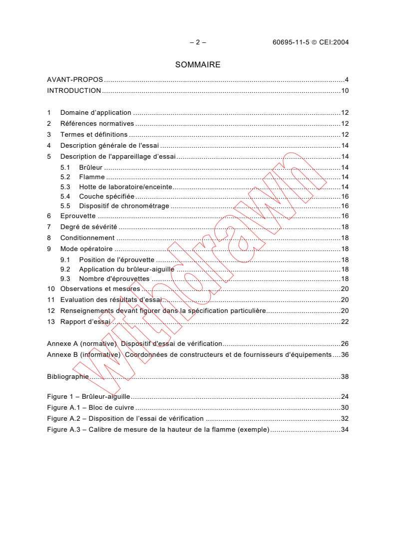 IEC 60695-11-5:2004 Spécifie un essai au brûleur-aiguille pour simuler l'effet d'une petite flamme qui peut provenir de conditions de défaut, afin d'évaluer par simulation le risque du feu. Elle est applicable aux matériels électrotechniques, à leurs sous-ensembles et à leurs composants et aux matériaux isolants électriques solides ou à d'autres matériaux combustibles. Cette première édition de la CEI 60695-11-5 annule et remplace la deuxième édition de la CEI 60695-2-2 publiée en 1991 et son amendement 1 (1994). Elle en constitue une révision technique. La structure de cette norme reste essentiellement la même avec l'ajout de plusieurs modifications et concepts majeurs: