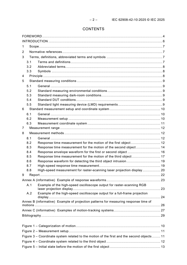 IEC 62908-42-10:2025 specifies standard measurement conditions and fundamental measurement methods of response time of interactive projection displays with sensors detecting the motion of the projector, the projected image on the object, or the third objects, interactively controlling the projection image responding to the motions.