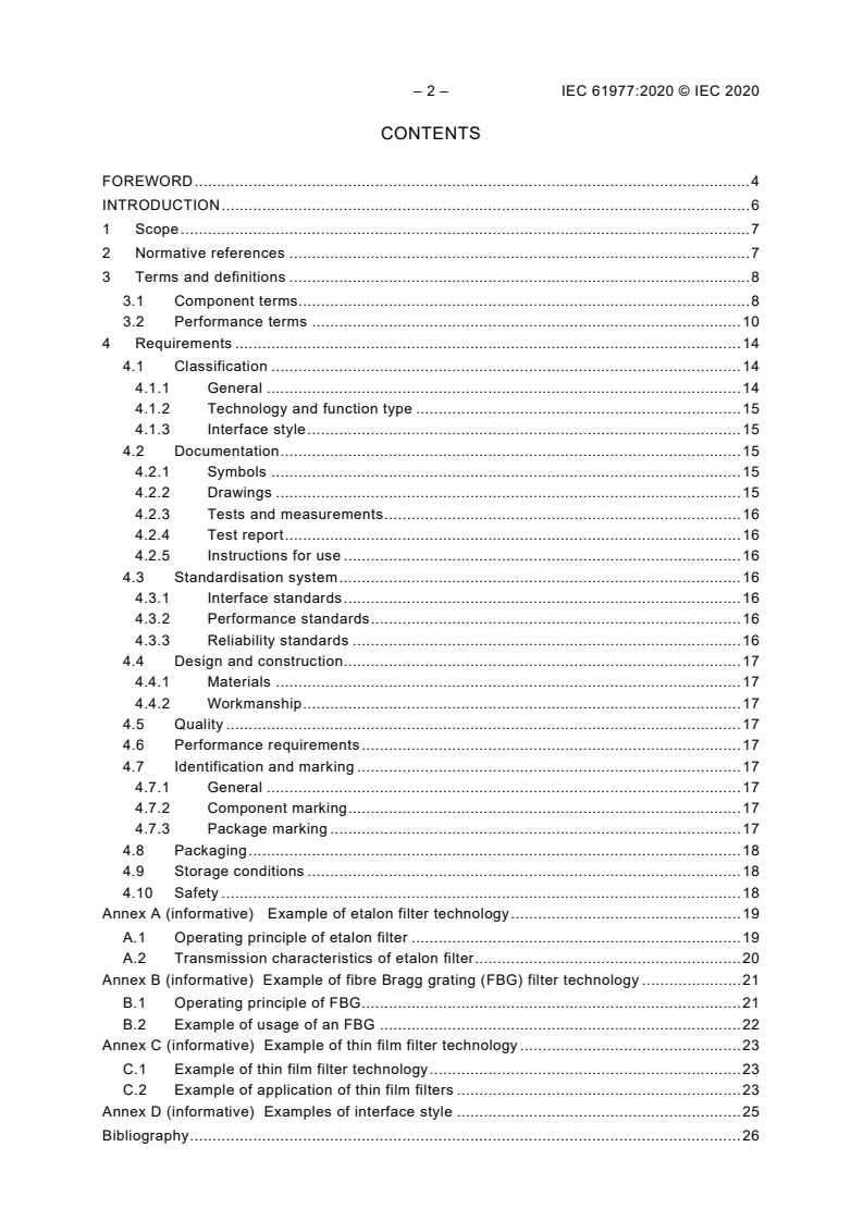 Keywords: IEC 61977:2020, fibre optic fixed filters, fibre optic filters, passive components, band‑pass filter, notch filter, gain flattening, optical fibre connectors, insertion loss, DWDM.