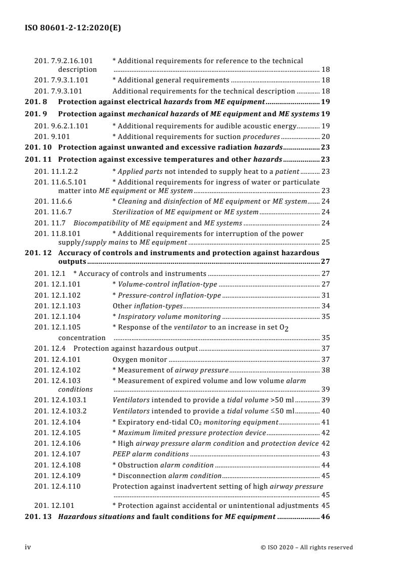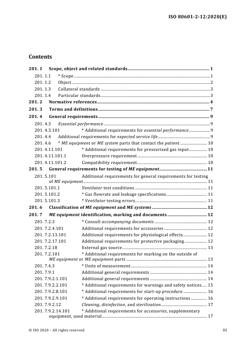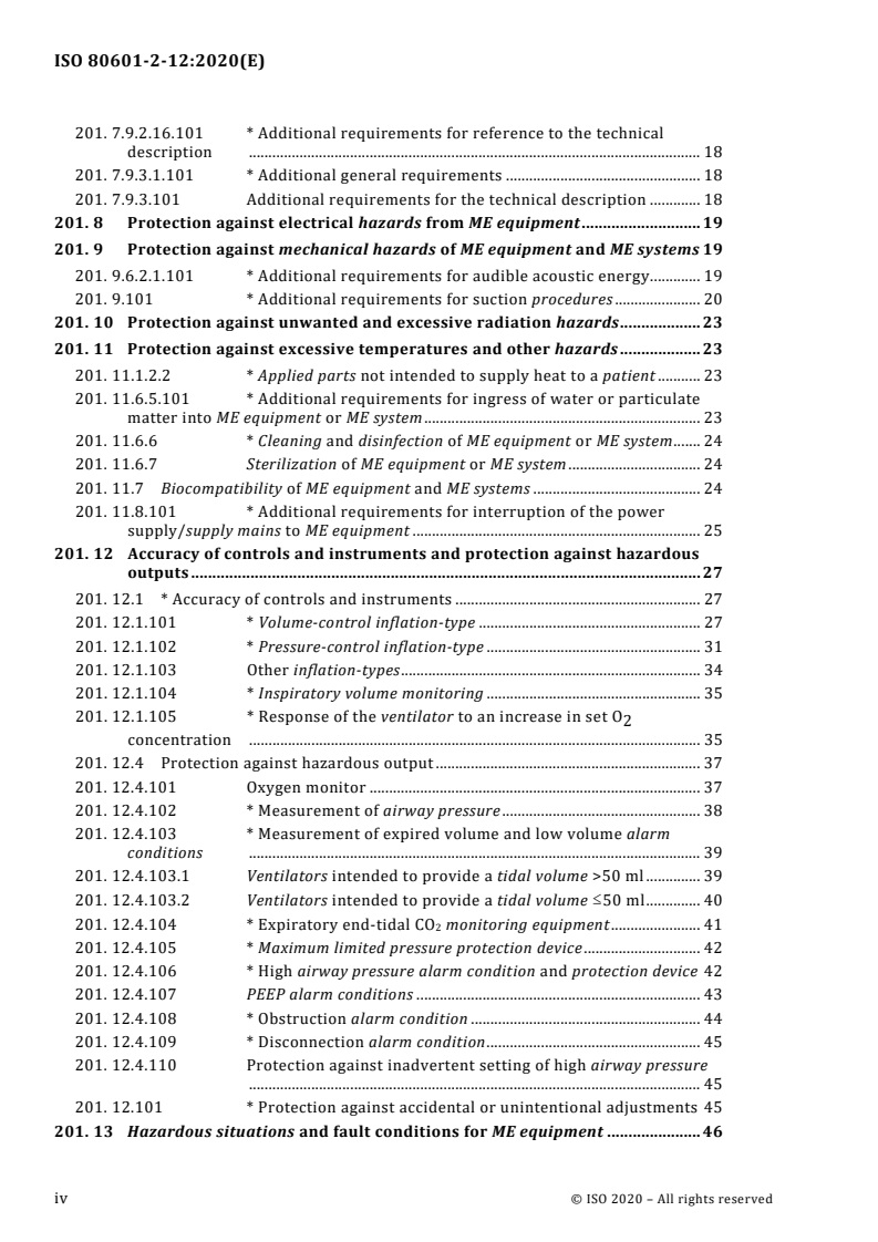 ISO 80601-2-12 supplements general ME equipment requirements (e.g., IEC/ISO 60601 series) with ventilator‑specific provisions. Key topics include: