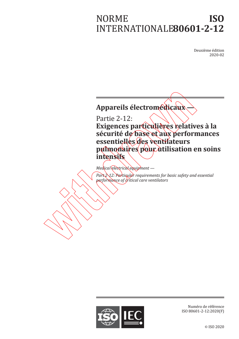 ISO 80601-2-12:2020 - Appareils électromédicaux - Partie 2-12: Exigences particulieres relatives a la sécurité de base et aux performances essentielles des ventilateurs pulmonaires pour utilisation en soins intensifs Released:2/25/2020