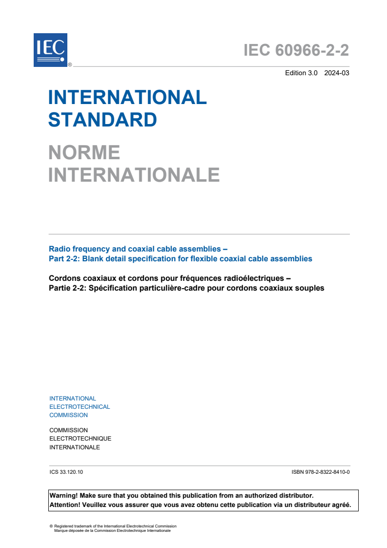 IEC 60966-2-2:2024 is an international standard published by the International Electrotechnical Commission (IEC) that provides a blank detail specification for flexible coaxial cable assemblies operating in the transverse electromagnetic mode (TEM). This standard is an integral part of the IEC 60966 series, which addresses radio frequency and coaxial cable assemblies.