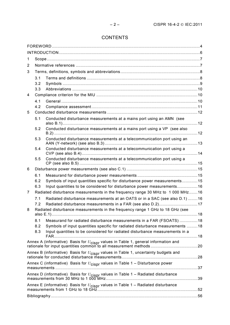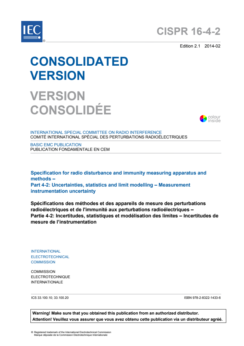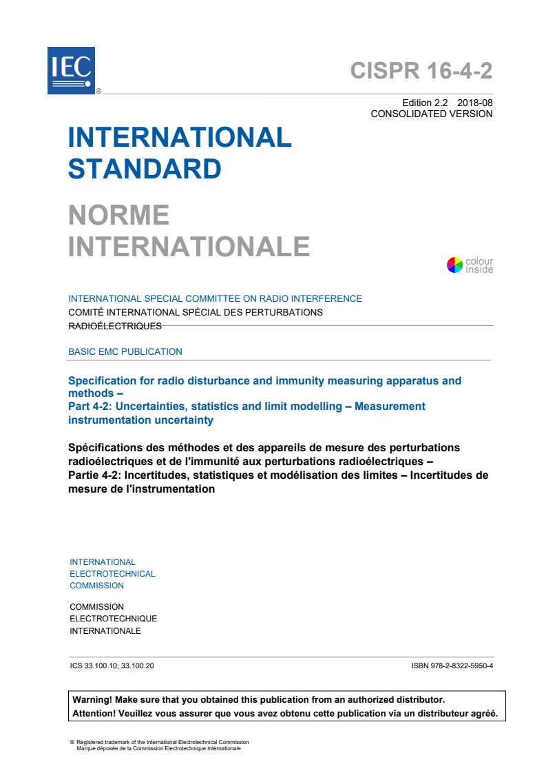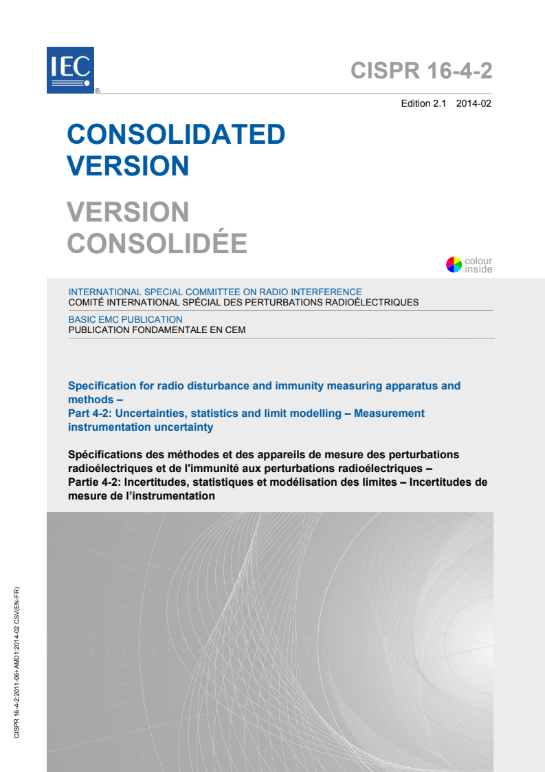 CISPR 16-4-2:2011 is a standard published by the International Electrotechnical Commission (IEC). Its full title is "Specification for radio disturbance and immunity measuring apparatus and methods - Part 4-2: Uncertainties, statistics and limit modelling - Measurement instrumentation uncertainty". This standard covers: CISPR 16-4-2:2011 is a basic EMC publication. It specifies the method of applying Measurement Instrumentation Uncertainty (MIU) when determining compliance with CISPR disturbance limits. The material is also relevant to any EMC test when interpretation of the results and conclusions reached will be impacted by the uncertainty of the measurement instrumentation used during testing. This second edition includes significant technical additions about methods of conducted disturbance measurements on mains and communication ports and about methods of radiated disturbance measurements using a FAR in the ranges of 30 MHz to 1 000 MHz and of 1 GHz to 18 GHz. The annexes contain the background material used in providing the amount of MIU found in generating the CISPR values shown in the main document and hence provide valuable background material for those needing both initial and further information on MIU and how to take individual uncertainties in the measurement chain into account. The annexes, however, are not intended to be a tutorial or user manual or to be copied when making uncertainty calculations. For that purpose, the references shown in the bibliography, or other widely recognized documents, may be used. Measurement instrumentation specifications are given in the CISPR 16-1 series, while the methods of measurement are covered in the CISPR 16-2 series. Further information and background on CISPR and radio disturbances is given in CISPR 16-3. The other parts of the CISPR 16-4 series contain further information on uncertainties in general, statistics and limit modelling. The contents of the corrigendum of April 2013 have been included in this copy.