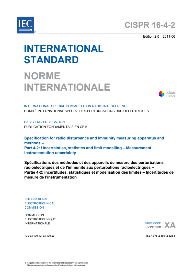 CISPR 16-4-2:2011 - Specification for radio disturbance and immunity measuring apparatus and methods - Part 4-2: Uncertainties, statistics and limit modelling - Measurement instrumentation uncertainty Released:6/8/2011