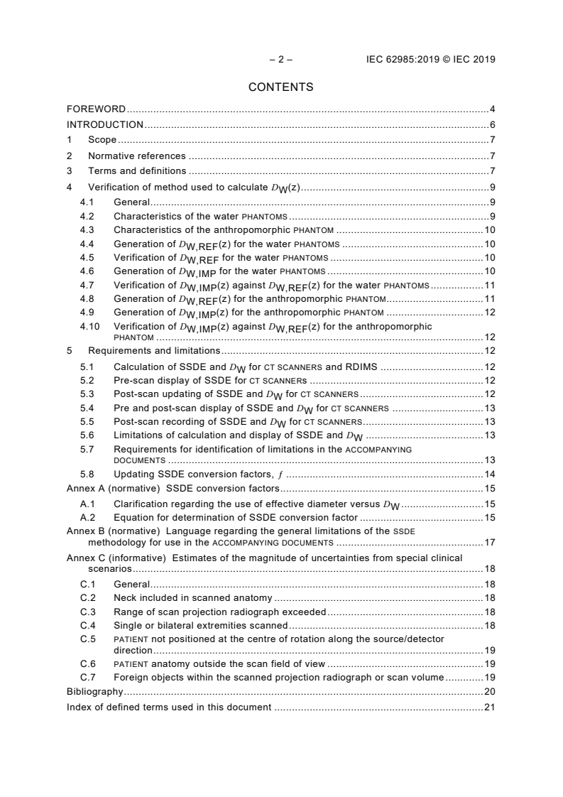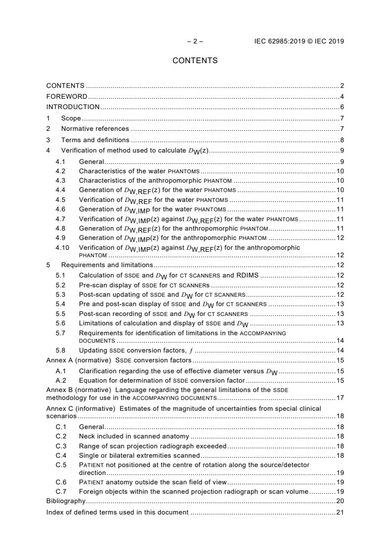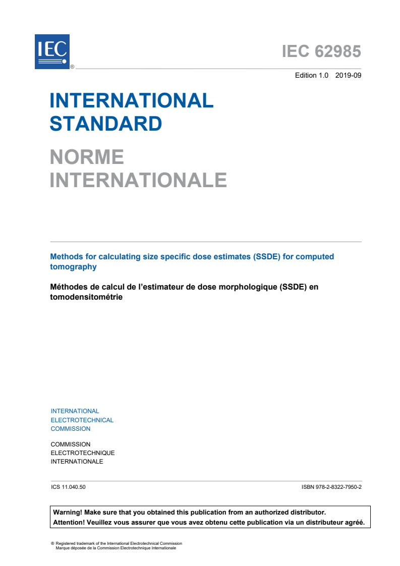 IEC 62985:2019 is a standard published by the International Electrotechnical Commission (IEC). Its full title is "Methods for calculating size specific dose estimates (SSDE) for computed tomography". This standard covers: IEC 62985:2019 applies to – CT SCANNERS that are able to display and report CTDIVOL in accordance with IEC 60601-2-44, and – RADIATION dose index monitoring software (RDIMS) for the purpose of calculating, displaying and recording the SIZE SPECIFIC DOSE ESTIMATE (SSDE) and its associated components. Specifically, this document provides standardized methods and requirements for calculating, displaying, or recording of SSDE, SSDE(z), WATER EQUIVALENT DIAMETER (DW), and DW(z), where z represents a specific longitudinal position of the scanned object. This document provides a method of determining a reference WATER EQUIVALENT DIAMETER, DW,REF(z), using CT scans of two cylindrical water PHANTOMS and one or more anthropomorphic PHANTOM(S), which conform to the specifications defined in this document. The method of calculating the WATER EQUIVALENT DIAMETER that is implemented by the MANUFACTURER, DW,IMP(z), is tested and validated against DW,REF(z) using the TEST OBJECTS and methods defined within this document. This document also describes the methods for calculating SSDE and DW, which represent the average values of SSDE(z) and DW(z) over the RECONSTRUCTION LENGTH. The contents of the corrigendum of June 2022 have been included in this copy.