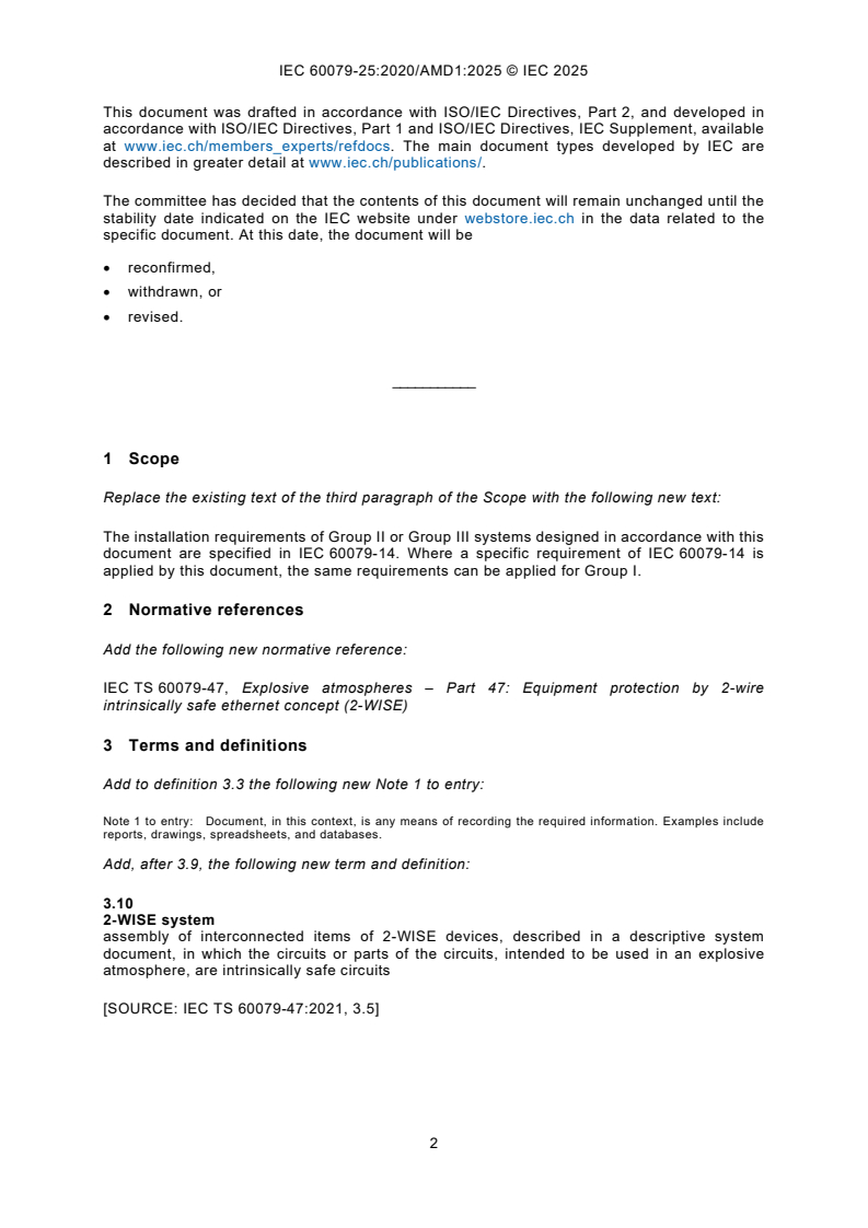 IEC TS 60079-47: Defines equipment protection by 2-wire intrinsically safe ethernet (2-WISE) systems, referenced extensively for 2-WISE technology requirements within this amendment.