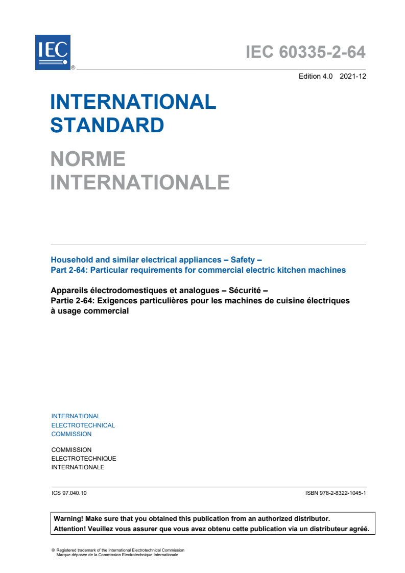 IEC 60335-2-64:2021 deals with the safety of electrically operated commercial kitchen machines, their rated voltage being not more than 250 V for single phase appliances connected between one phase and neutral, and 480 V for other appliances including direct current (DC) supplied appliances and battery operated appliances.