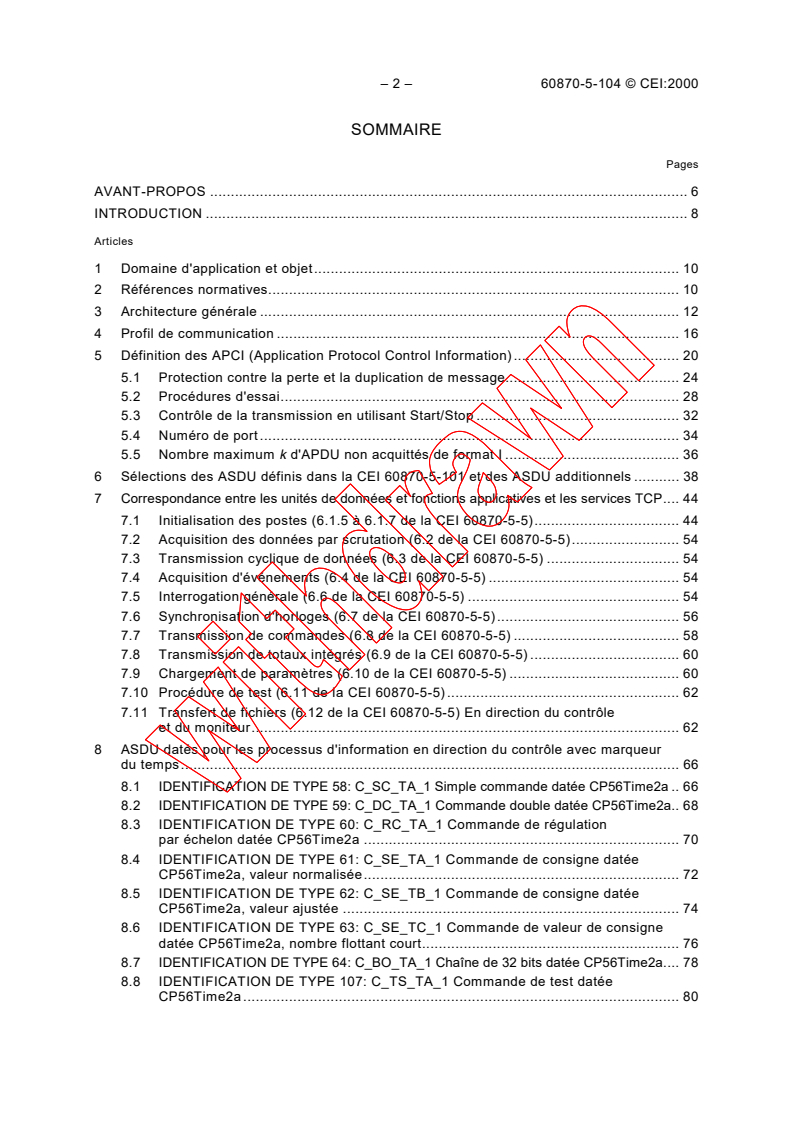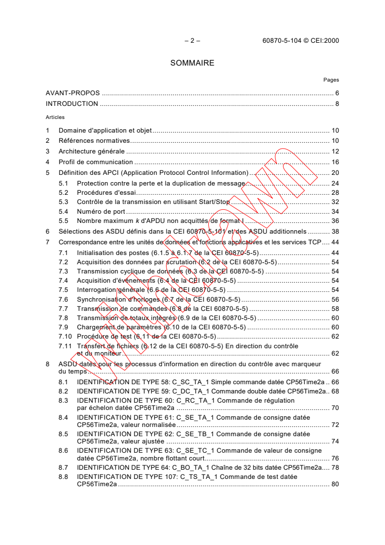 iec60870-5-104{ed1.0}fr_d - IEC 60870-5-104:2000 - Matériels et systèmes de téléconduite - Partie 5-104: Protocoles de transmission - Accès aux réseaux utilisant des profils de transport normalisés pour la CEI 60870-5-101 Released:12/21/2000