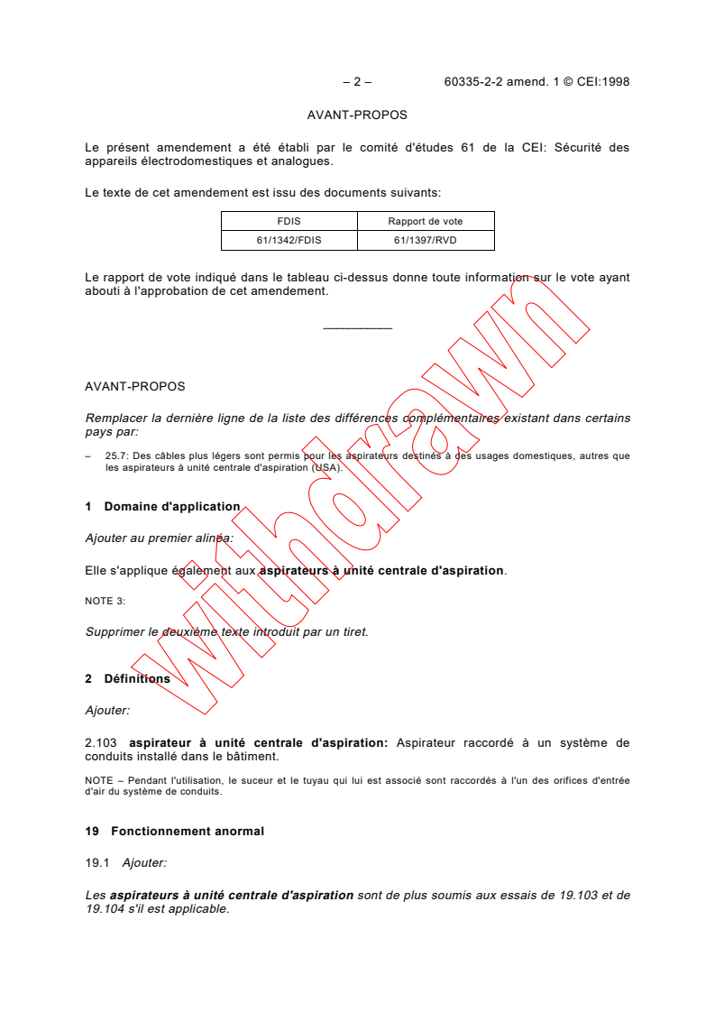 IEC 60335-2-2:1993/AMD1:1998 - Amendment 1 - Safety of household and similar electrical appliances - Part 2: Particular requirements for vacuum cleaners and water suction cleaning appliances Released:1/16/1998