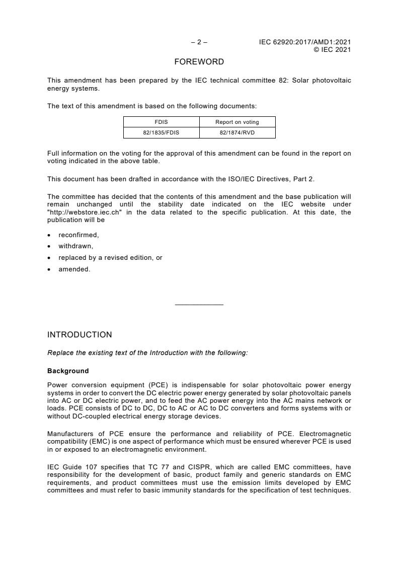 IEC 62920:2017/AMD1:2021 is a standard published by the International Electrotechnical Commission (IEC). Its full title is "Amendment 1 - Photovoltaic power generating systems - EMC requirements and test methods for power conversion equipment". This standard covers: Amendment 1 - Photovoltaic power generating systems - EMC requirements and test methods for power conversion equipment