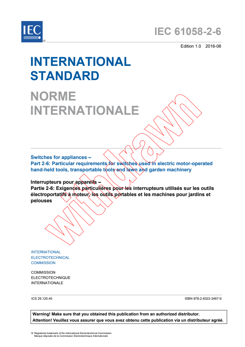 IEC 61058-2-6:2016 - Switches for appliances - Part 2-6: Particular requirements for switches used in electric motor-operated hand-held tools, transportable tools and lawn and garden machinery Released:6/15/2016