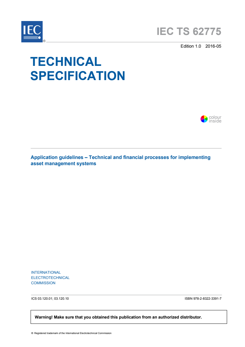 IEC TS 62775:2016 provides application guidelines for implementing Asset Management Systems (AMS) by linking the ISO 5500x asset management requirements with technical and financial standards. This Technical Specification shows how the IEC dependability suite, ISO/IEC/IEEE systems engineering lifecycle processes and International Financial Reporting Standards (IFRS and IAS) can support an AMS to enable integrated, risk‑based decision‑making processes.