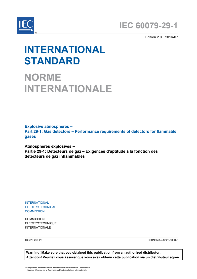 IEC 60079-29-1:2016 - Explosive atmospheres - Part 29-1: Gas detectors - Performance requirements of detectors for flammable gases Released:7/21/2016