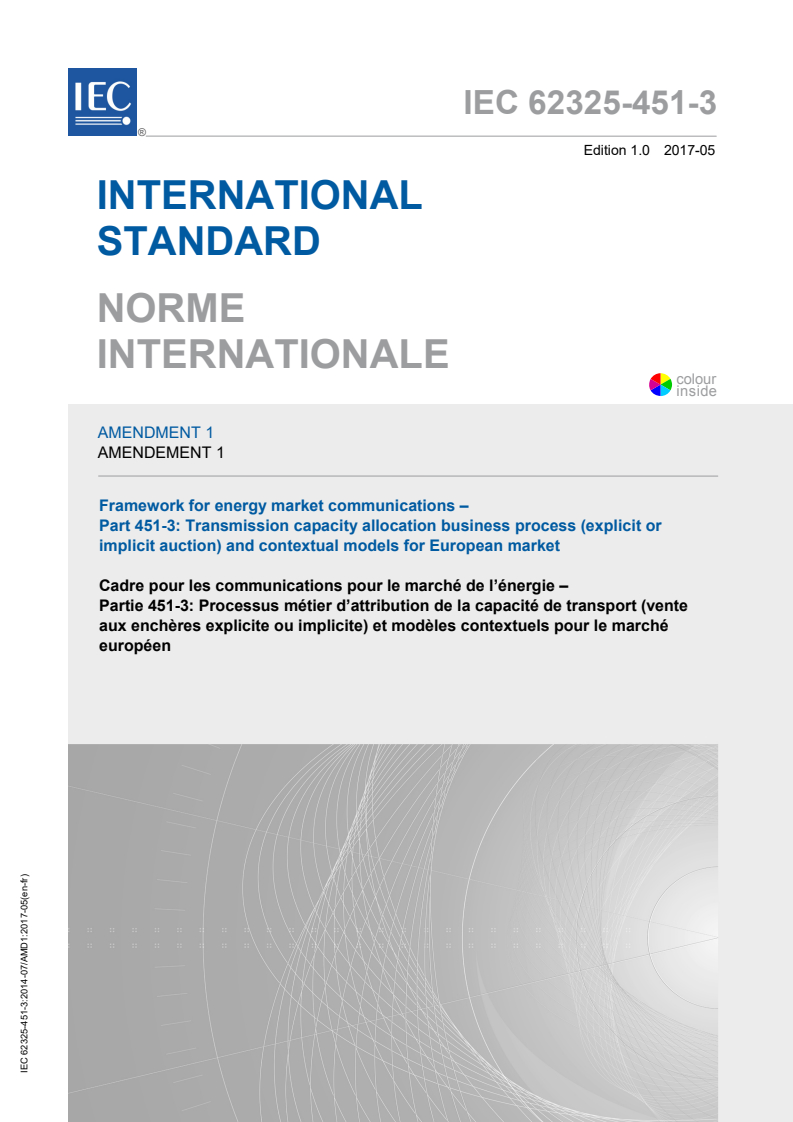 IEC 62325-451-3:2014/AMD1:2017 - Amendment 1 - Framework for energy market communications - Part 451-3: Transmission capacity allocation business process (explicit or implicit auction) and contextual models for European market Released:5/5/2017