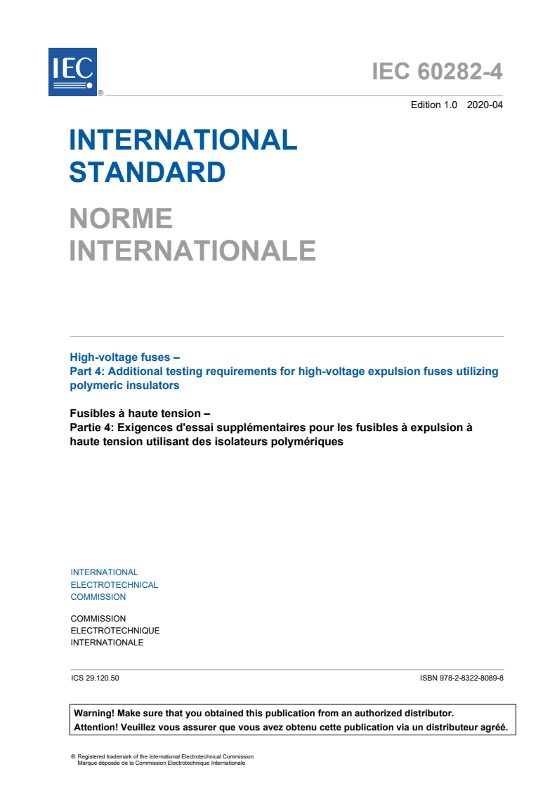 IEC 60282-4:2020 is a standard published by the International Electrotechnical Commission (IEC). Its full title is "High-voltage fuses - Part 4: Additional testing requirements for high-voltage expulsion fuses utilizing polymeric insulators". This standard covers: IEC 60282-4:2020 applies to expulsion fuses complying with IEC 60282-2 and specifies additional testing requirements for fuses employing a cutout fuse-base that utilizes polymeric insulators.