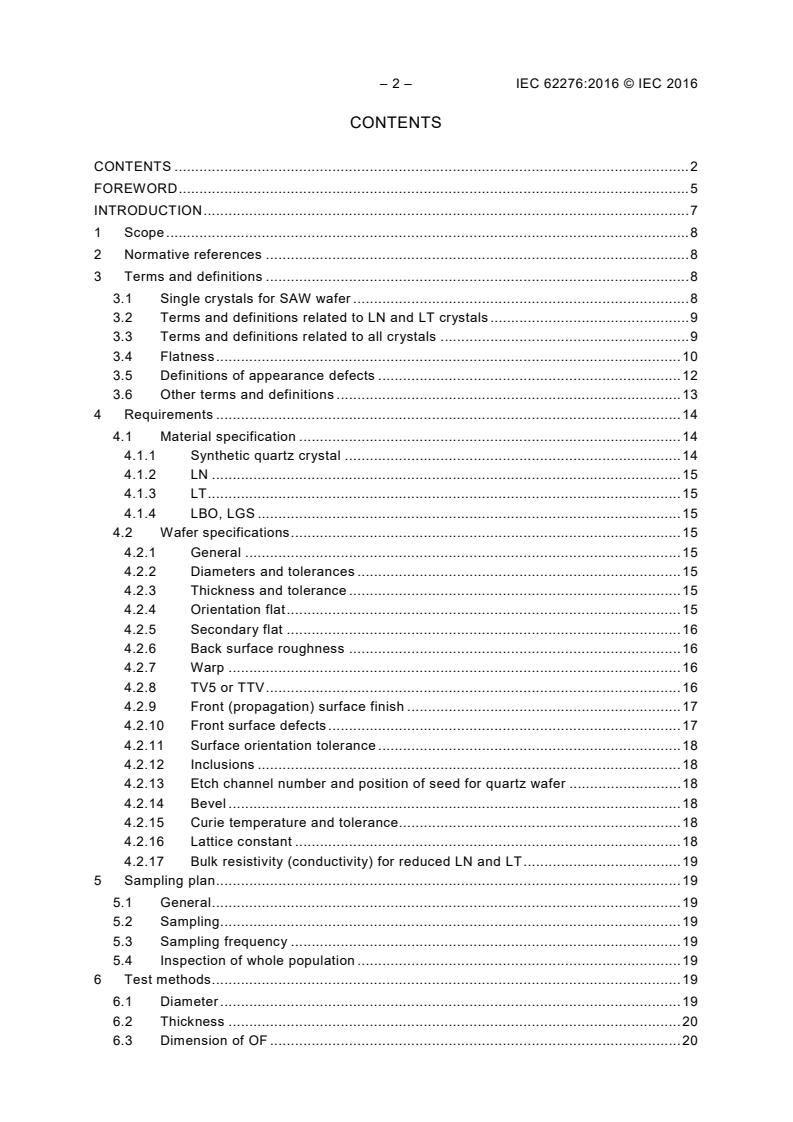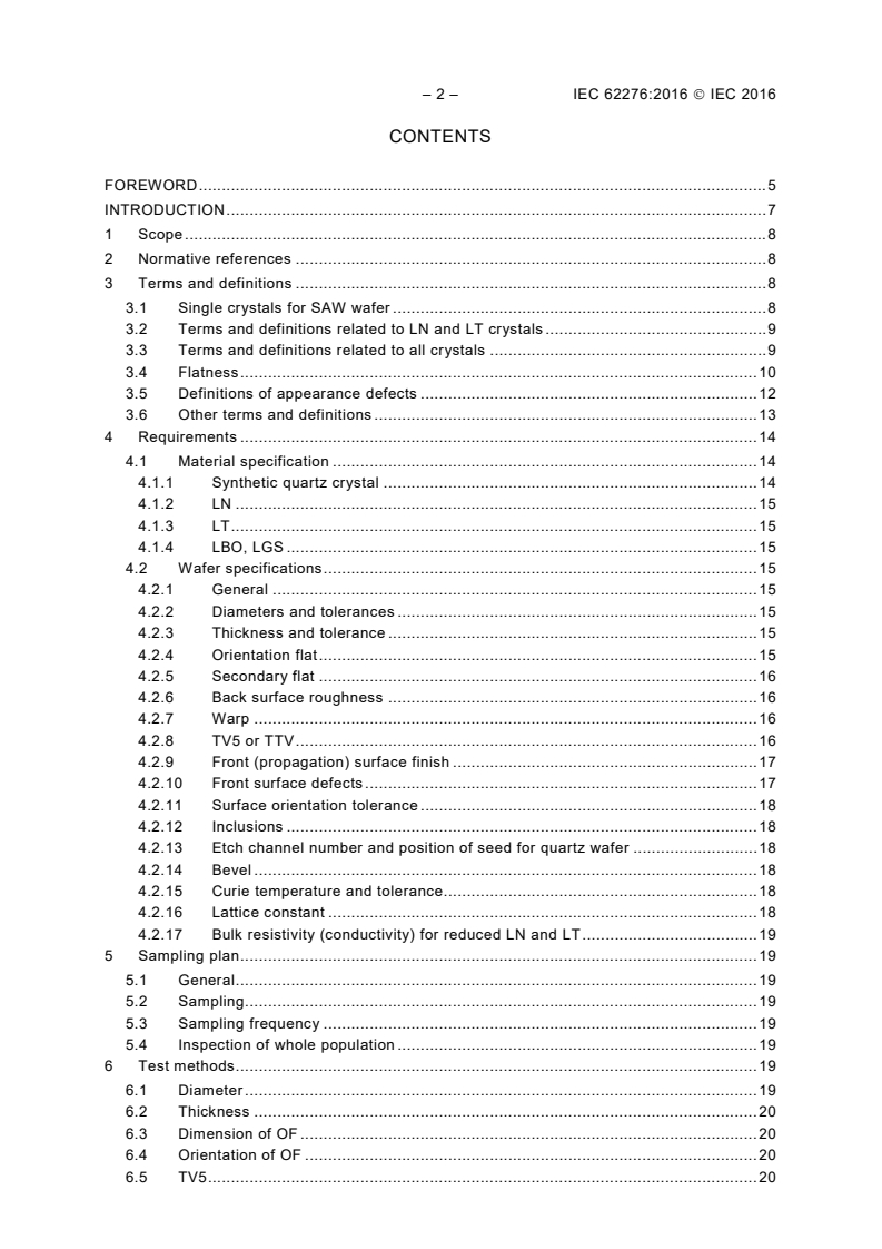 IEC 62276:2016 is the international standard that specifies requirements and measuring methods for single crystal wafers used as substrates in surface acoustic wave (SAW) filters and resonators. It covers synthetic quartz, lithium niobate (LN), lithium tantalate (LT), lithium tetraborate (LBO) and lanthanum gallium silicate (LGS) wafers. The document defines material specifications, wafer geometries, surface and bulk properties, inspection sampling and test methods used in manufacturing and quality control of SAW wafers.
