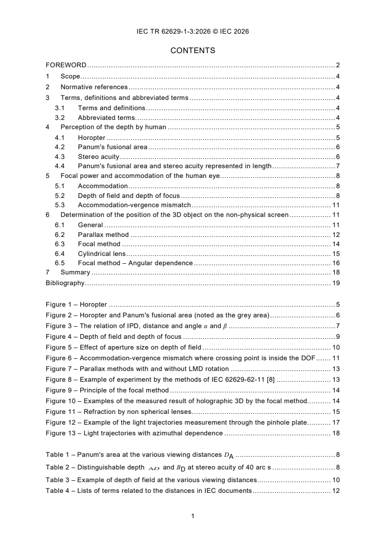 IEC TR 62629-1-3:2026, which is Technical Report, is intended to gather technical information of depth perception by human and determination of the position of 3D object on the non-physical screen. Clause 4 and Clause 5 describe the human depth perception and its threshold. This information will be helpful in designing 3D displays of the non-physical screen type such as the possible depth difference of 3D objects. In the measurement of the display, understanding the response and limitation of the user is useful. Clause 4 and 5 provide such information in determining the 3D object on the non-physical screen. It is not the intention of this document to set the requirement of the measurement system in determining the position of 3D object on the non-physical screen.