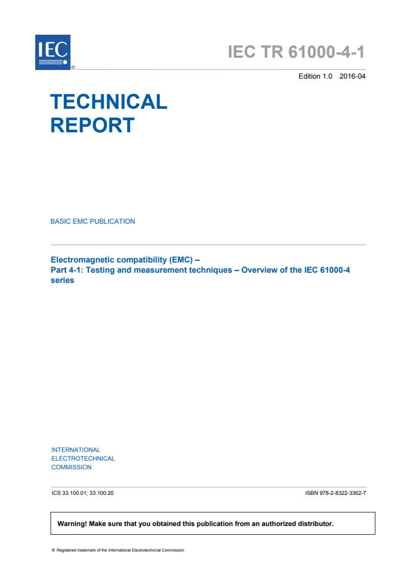 IEC TR 61000-4-1:2016 is a technical report published by the International Electrotechnical Commission (IEC). Its full title is "Electromagnetic compatibility (EMC) - Part 4-1: Testing and measurement techniques - Overview of IEC 61000-4 series". This standard covers: IEC TR 61000-4-1:2016(E) gives information and guidance on the EMC basic standards and other basic EMC documents published in the IEC 61000-4 series. Those basic standards describe mainly immunity tests to be considered and applied for electric and electronic equipment, including systems. It has the status of a basic EMC publication in accordance with IEC Guide 107. This first edition as a Technical Report cancels and replaces the third edition of the International Standard published in 2006. This edition constitutes a technical revision.