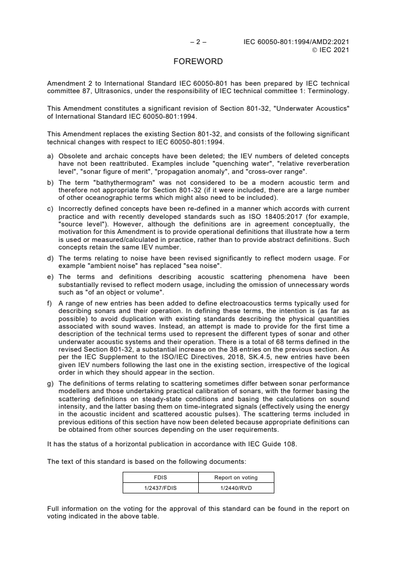 Keywords: IEC 60050-801, International Electrotechnical Vocabulary, acoustics terminology, electroacoustics, underwater acoustics, sonar terminology, ambient noise, acoustic scattering, IEC standards, ISO 18405, technical vocabulary, electrotechnology standards, underwater sonar, acoustic system definitions, terminology amendment.