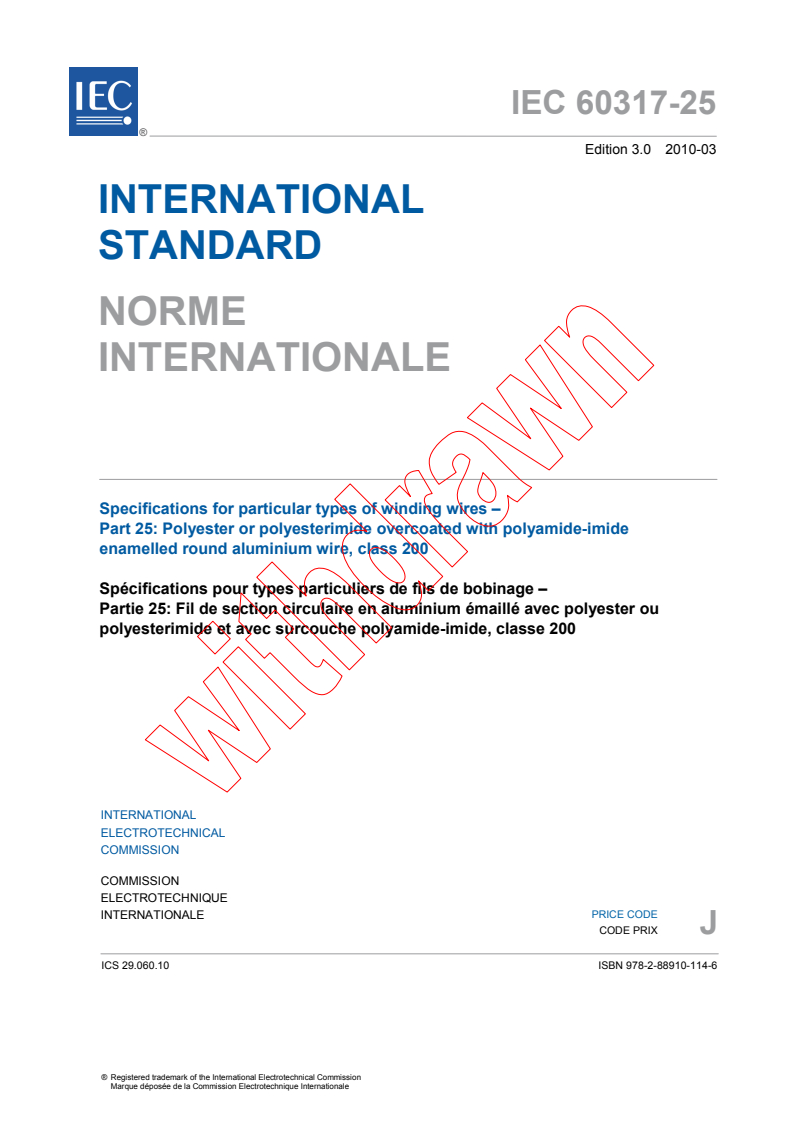 IEC 60317-25:2010 is a standard published by the International Electrotechnical Commission (IEC). Its full title is "Specifications for particular types of winding wires - Part 25: Polyester or polyesterimide overcoated with polyamide-imide enamelled round aluminium wire, class 200". This standard covers: IEC 60317-25:2010 specifies the requirements of enamelled round aluminium winding wires of class 200 with a dual coating. The underlying coating is based on polyester or polyesterimide resin, which may be modified providing it retains the chemical identity of the original resin and meets all specified wire requirements. The superimposed coating is based on polyamide-imide resin. The main changes with respect to the previous edition are: - Clause 3: addition of 3.3: Appearance; - Clause 16: reference to the test for resistance to refrigerants in IEC 60851-4; - Clause 22: deletion of the high temperature failure requirement; - Clause 23: addition of pin hole test requirement.