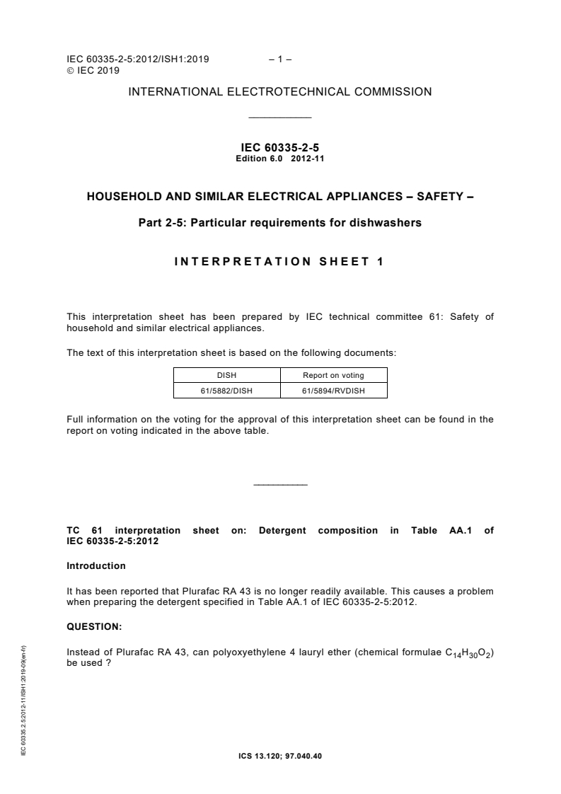 IEC 60335-2-5:2012 is an international standard published by the International Electrotechnical Commission (IEC) that specifies the safety requirements for household and similar electric dishwashers. This sixth edition, including its 2018 amendment, sets stringent safety criteria for dishwashers designed primarily for washing and rinsing dishes, cutlery, and other utensils with rated voltages up to 250 V for single-phase and 480 V for other appliances. It aims to address common hazards faced by general consumers in domestic and similar settings, ensuring reliable and safe operation while excluding professional or commercial dishwashing units.