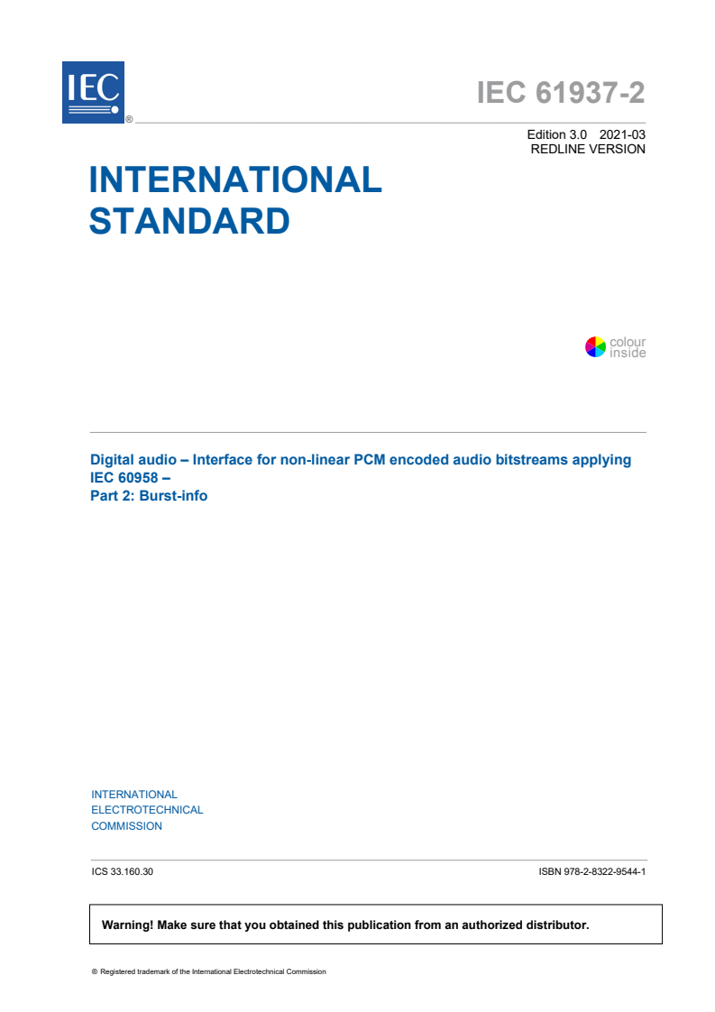 IEC 61937-2:2021 RLV - Digital audio - Interface for non-linear PCM encoded audio bitstreams applying IEC 60958 - Part 2: Burst-info Released:3/8/2021