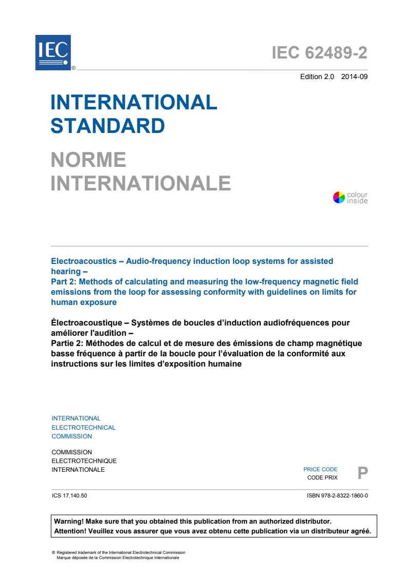 IEC 62489-2:2014 is a standard published by the International Electrotechnical Commission (IEC). Its full title is "Electroacoustics - Audio-frequency induction loop systems for assisted hearing - Part 2: Methods of calculating and measuring the low-frequency magnetic field emissions from the loop for assessing conformity with guidelines on limits for human exposure". This standard covers: IEC 62489-2:2014 applies to audio-frequency induction-loop systems for assisted hearing. It may also be applied to such systems used for other purposes, as far as it is applicable. The standard is intended for assessment of human exposure to low-frequency magnetic fields produced by the system, by calculation and by in-situ testing. This standard does not deal with other aspects of safety, for which IEC 60065 applies, or with EMC. This second edition cancels and replaces the first edition published in 2011. This edition constitutes a technical revision which includes significant technical changes to reflect several updates to the ICNIRP Guide (Guidelines for limiting exposure to time-varying electric, magnetic, and electromagnetic fields) to which it makes frequent reference. The most significant change is that the underlying metric in the Guide has been changed from tissue current density to induced electric field. Keywords: hearing aid, accessibility, surdity, deafness
