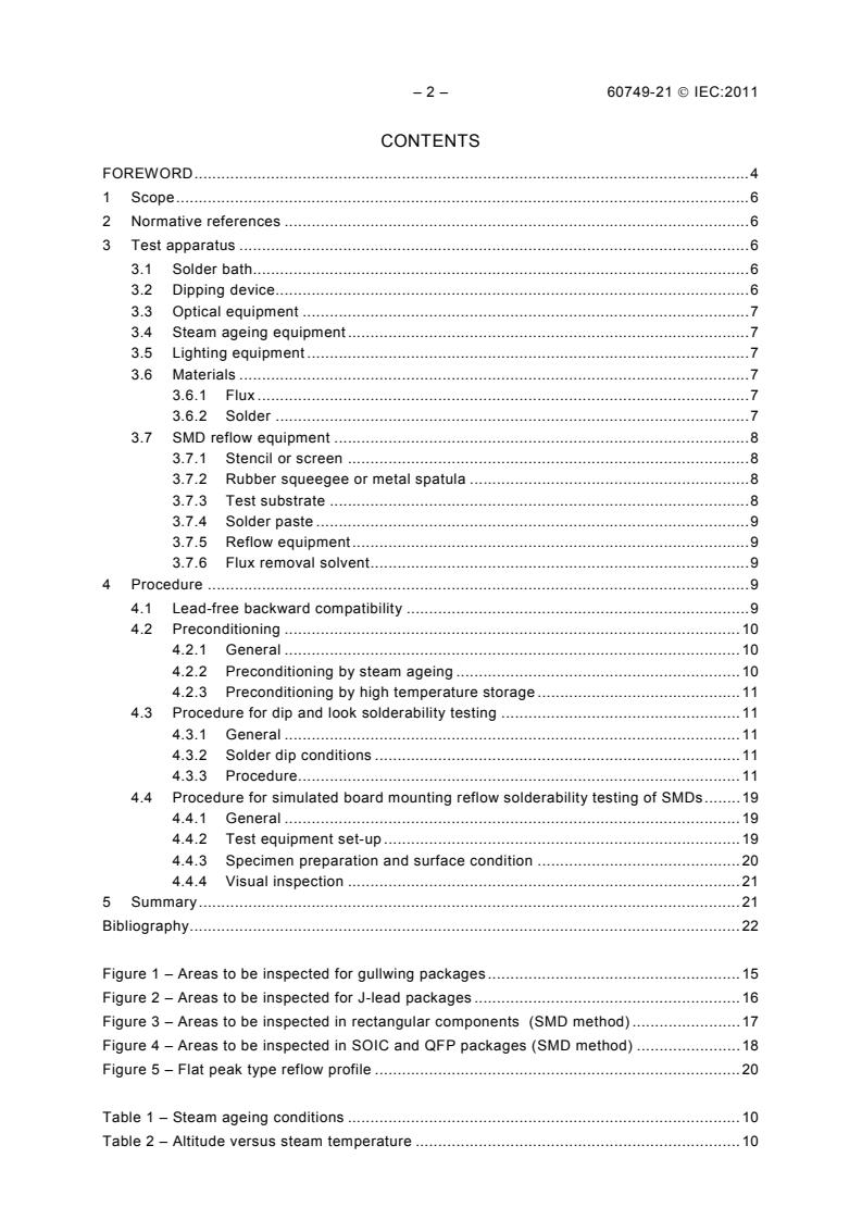 IEC 60749-21:2011 is a standard that establishes a procedure for testing the solderability of device package terminations that are meant to be joined to another surface using tin-lead or lead-free solder. This test method can be used for through hole, axial, and surface mount devices. It also includes an optional procedure for a board mounting solderability test for surface mount devices. The test method provides optional conditions for ageing, but it is considered destructive unless stated otherwise in the relevant specification. This standard is a revision of the first edition published in 2004 and now includes compatibility with lead-free solder. Note that it does not assess the effect of thermal stresses during the soldering process, for which reference should be made to IEC 60749-15 or IEC 60749-20.